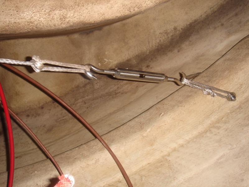 "After analyzing the rudder loads, I decided to secure the top of the rudder post in place using Spectra line and turnbuckles. I tied a piece of Spectra around the top of the rudder post and ran it horizontally to port where I secured it to an existing hull stiffener. I did the same to starboard, tightened the turnbuckles, and I was done! The rudder post was secured in place. I tested it out on a windy sail to Moorea and found no movement at all."