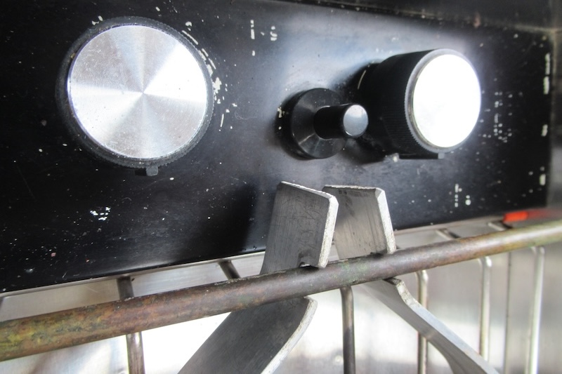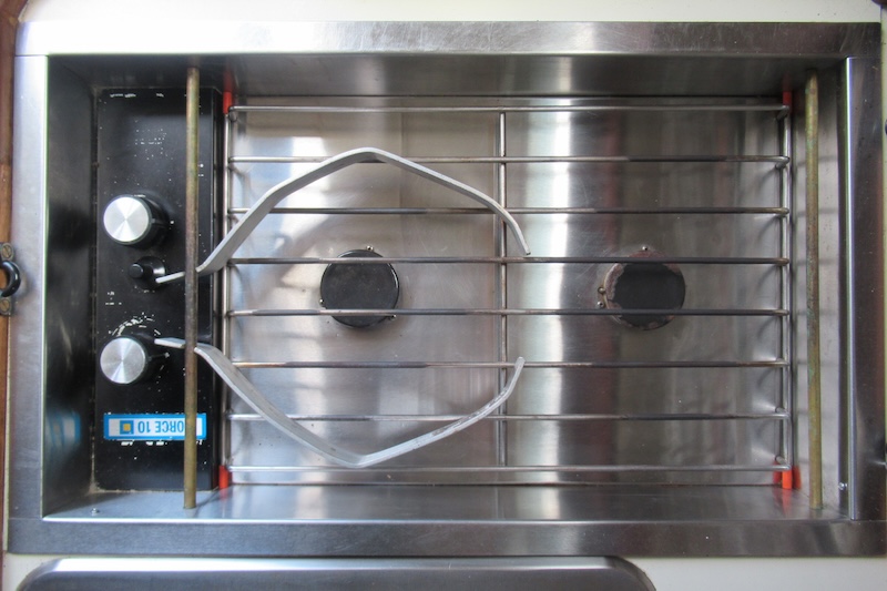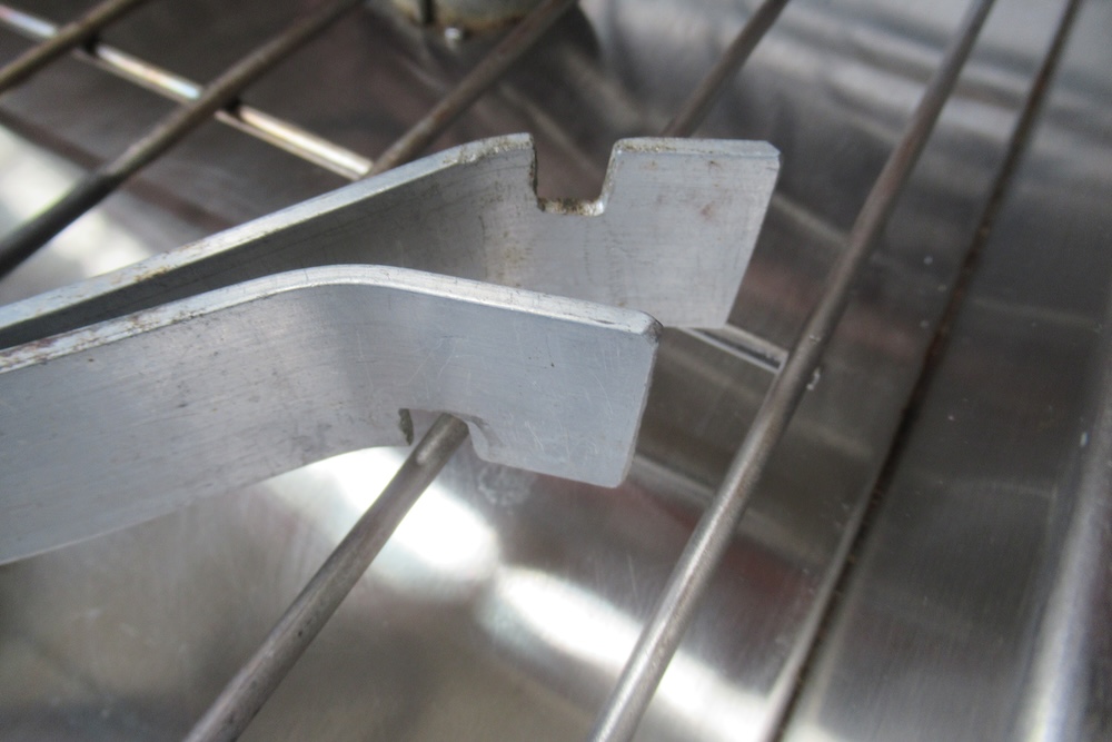 Whereas the factory version uses plastic knobs to secure the pot holders to the rail to hold your pan, my version uses opposing forces. The plastic knobs make a very positive connection, but are prone to melting, and the stainless steel gets very hot. The thin aluminum of The Resourceful Sailor’s version also gets hot, but cools quickly. Both require mindful use and a stove mitten.